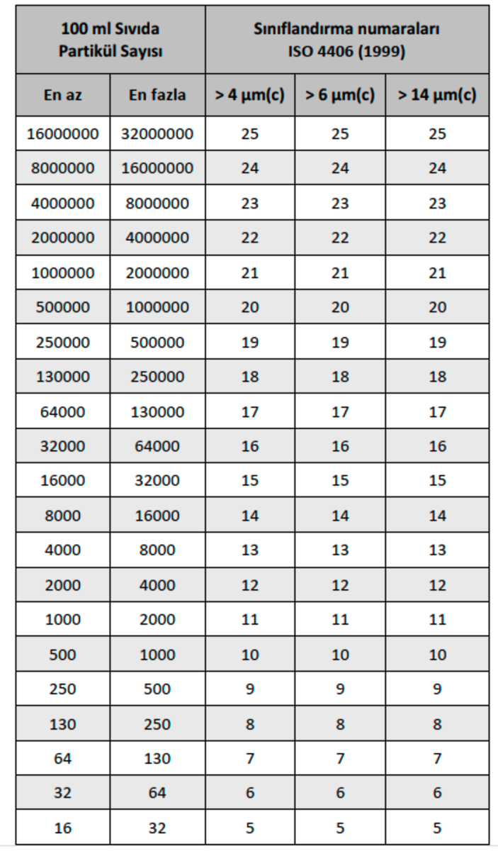 ISO 4406 (1999) standardına göre yağın temizlik sınıfını belirlemek amacıyla lazer partikül sayacı kullanılır. Bu sayaç, 100 ml hidrolik yağ içinde >4 μm (c), >6 μm (c) ve >14 μm (c) boyutundaki partikülleri sayar. Sayımı yapılan partiküller, bir sınıflandırma numarası ile eşleştirilir (örneğin:14/11/8) ve bu da ISO temizlik sınıfına karşılık gelir. Burada dikkat edilmesi gereken, bir üst sınıfa geçildiğinde partikül sayısının yaklaşık iki katına çıkmasıdır. Hedeflenen temizlik seviyesi, doğru filtrasyon sisteminin seçiminde önemli bir kriterdir.
