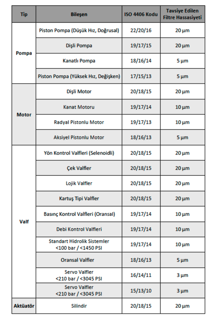 Hidrolik sistemde bulunan bileşenler, esas olarak filtrasyon sisteminin mikron derecesini belirler.