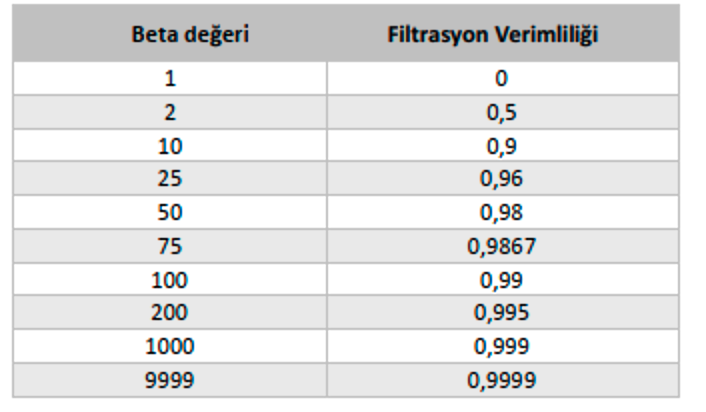 Yani ß10 > 200, yaklaşık olarak %99,5 filtrasyon verimliliği anlamına gelir.